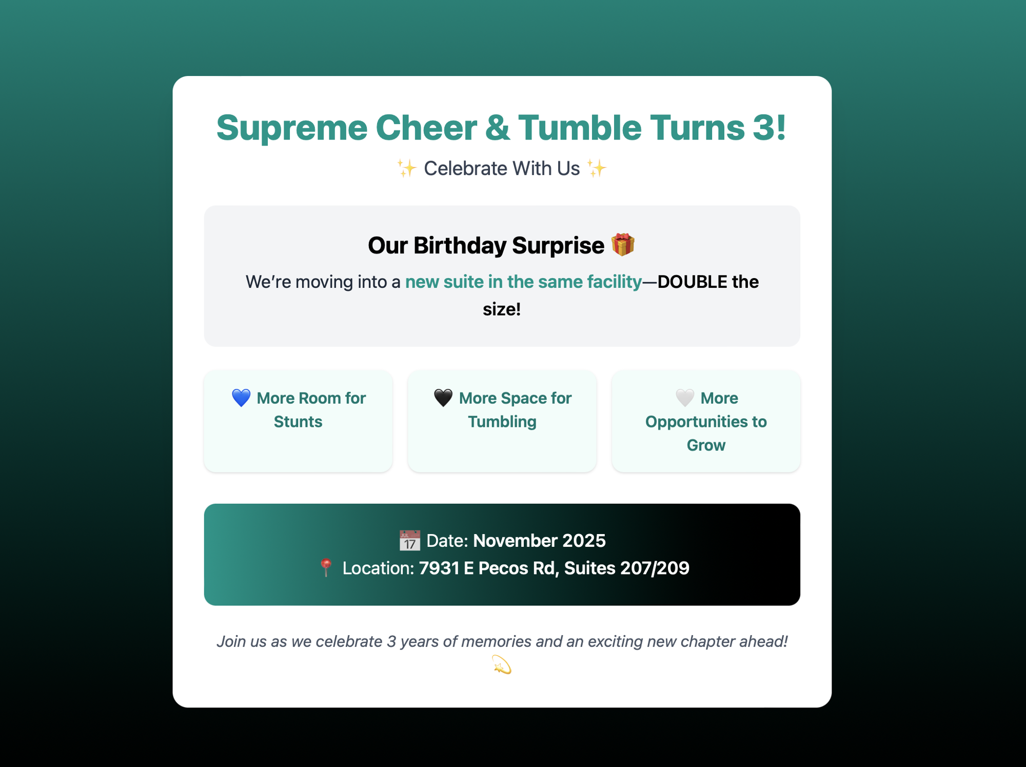 We’re Growing! Supreme Cheer & Tumble’s Big Birthday Surprise