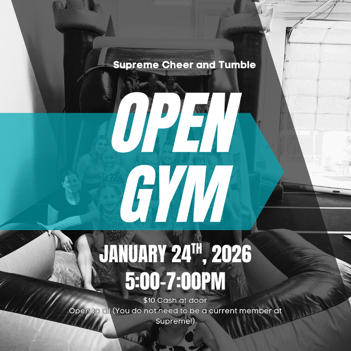 Open Gym is a fun, relaxed time for athletes to come in, play with friends, work on tumbling, and enjoy the gym in a supervised environment. This event is open to everyone — athletes do not need to be current Supreme members to attend.